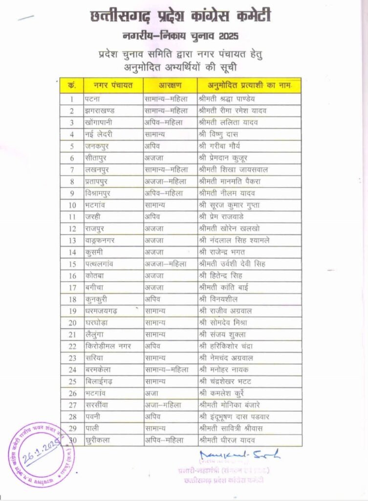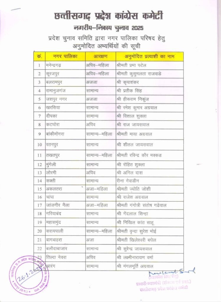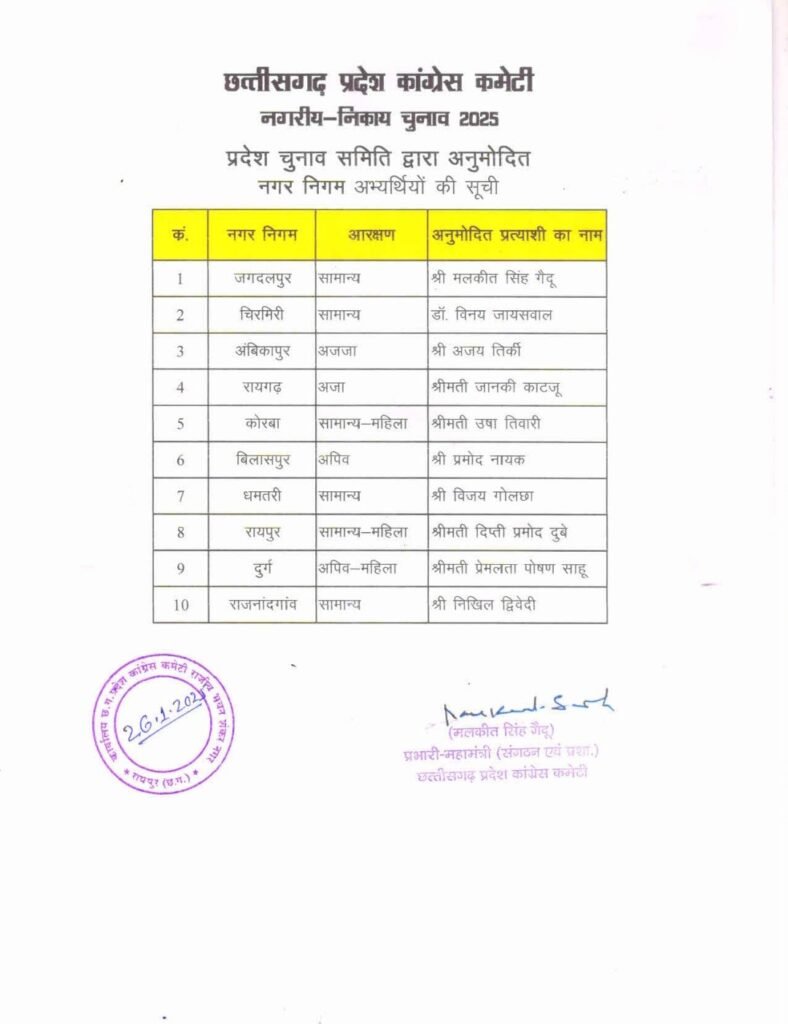 भाजपा ने सभी 10 नगर निगमों के प्रत्याशियों की घोषणा की